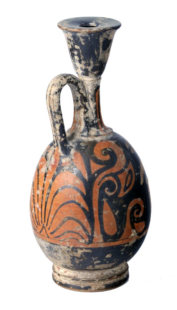 Lekythos apula a figure rosse con donna che indossa chitone stretto in vita e ha i capelli chiusi nella mitella; tiene nella sinistra una corona e con la destra una patera sopra un'ara. Sotto l'ansa palma con viticci e fiori.