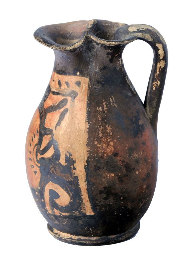 Oinochoe apula a figure rosse con piccola bocca tripartita con testa femminile.