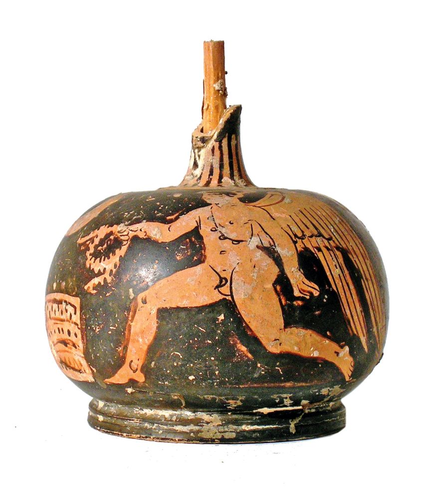 Lechythos apula a figure rosse spezzato. Eros in corsa a sinistra con in mano una corona che destina ad un'ara rettangolare, palmetta sotto l'ansa.