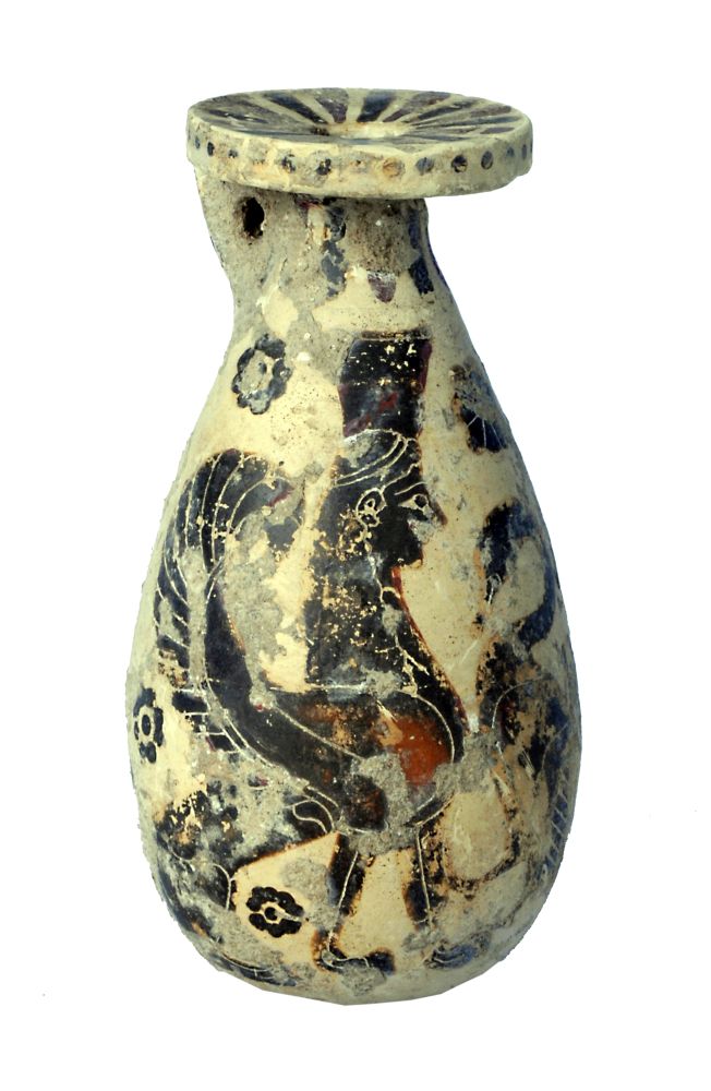 Alabastron piriforme con due animali fantastici (sfingi a corpo di leone, ali e testa femminile) separate da un cigno.
