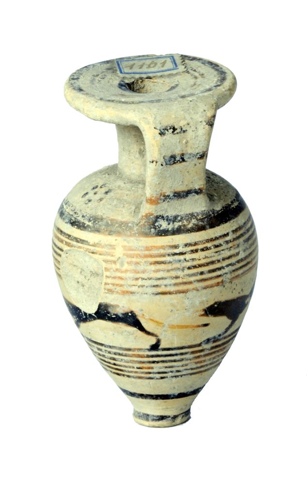 Aryballos piriforme rastremato verso il puntale a fasce con larga zona decorata da tre cani in corsa.
