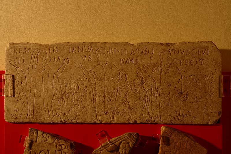La scena raffigura all'interno di un ambiente agreste (il Paradiso) tre personaggi che si distinguono per gli abiti raffinati: due uomini che indicano con la mano destra una donna che si trova alla loro sinistra. Essa, di nome Crescentina sta in posizione di orante con il capo velato e indossa sopra la tunica manicata una dalmatica ornata di clavi. Al centro, tra ramoscelli e due colombe, sta Ianuarius con sopravveste sulla tunica manicata. Il terzo personaggio, tra due alberi, Flavius Aquilinus, porta tunica manicata corta legata al fianco e ornata da un orbiculum sulla spalla destra, sulla quale è affibbiata una lunga clamide impreziosita dal ricamo di un inserto quadrato (tablion).