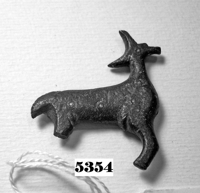 Fibula laminare a forma di cervo, priva dell'ardiglione; l'occhio è raffigurato con un occhio di dado.