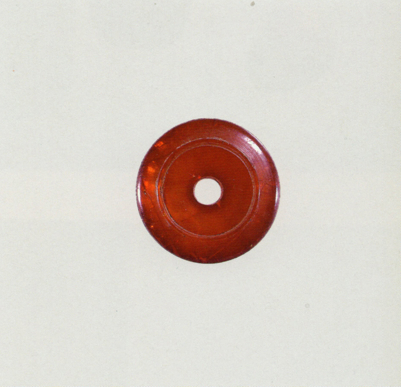 Dischetto a bottone rotondo con due facce piane, forato al centro, con un solco circolare a tornio su ogni faccia.