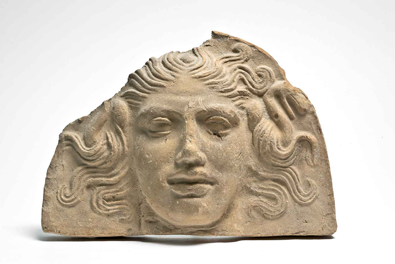 Argilla color grigio chiaro, in frattura color beige chiaro. Presenta la stessa tipologia dell'antefissa inv. 2370 (T.8), probabilmente provenienti dalla stessa matrice.
