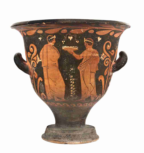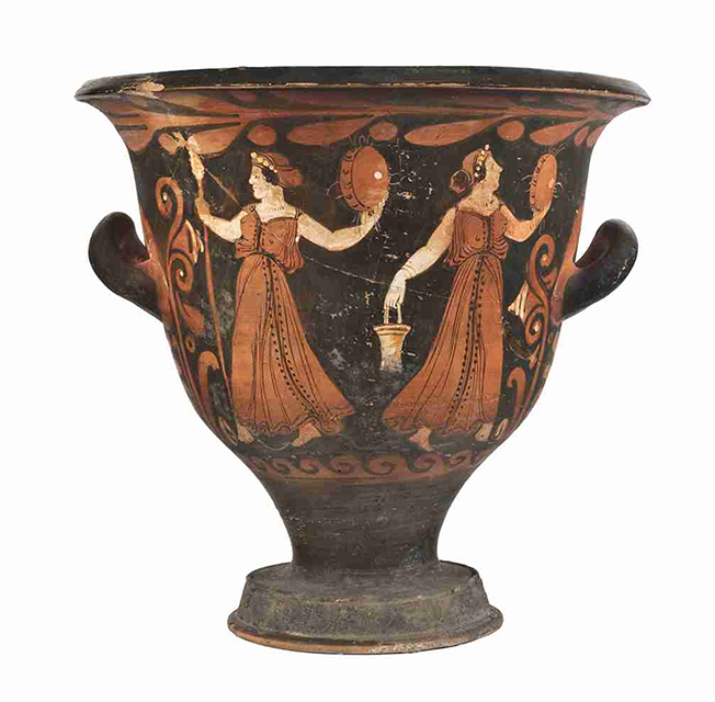 L'imboccatura del vaso è ampia, con orlo estroflesso e labbro marcato da uno spigolo vivo; il corpo è campaniforme e, con un corto stelo, poggia su un piede troncoconico con listello alla base e allo spigolo. Le anse a bastoncello sono impostate orizzontalmente a metà della vasca e incurvate verso l'alto. La vernice nera, tendenzialmente opaca e con diffusi problemi di cottura, copre anche l'interno della vasca del vaso e risparmia l'attaccatura e la parte dietro alle anse; molti dettagli sono resi con sovradipinture bianche e gialle. Il colore dell'argilla oscilla tra Munsell 7.5YR 6/4 (light reddish brown) e 2.5YR 3/6 (dark red). Sul lato A troviamo una scena a tema dionisiaco, con due menadi danzanti: la fanciulla a sinistra è rappresentata con il volto di profilo verso sinistra, con il torso di tre quarti e le gambe in una dinamica posizione di danza, la sini-stra frontale e la destra di profilo; la pelle è resa con sovradipintura bianca. I capelli sono raccolti in un sakkos, da cui esce una ciocca di capelli ricciuti, e sono ornati da un diadema di perle, che si aggiunge agli orecchini con pen-dente in forma di triangolo rovesciato, alla collana, dipinta con semplici trattini paralleli, e ai bracciali. La figura veste un lungo chitone cinto in vita e riccamente pieghettato, decorato con una sottile banda nera verticale, che parte dalla scollatura e arriva ai piedi, tra due file di punti neri: la stoffa leggera fa intravedere le forme del corpo. Entrambe le braccia sono tese: la destra regge un tirso, la sinistra un tamburello. La menade a destra è molto simile all'altra e sostanzialmente simmetrica: il volto è di profilo, il torso di tre quarti con la gamba destra di fronte e la sinistra di profilo. I capelli sono raccolti nel sakkos, ma in questo caso oltre a una ciocca ne esce lo chignon. I gioielli e il chitone sono analoghi a quelli dell'altra menade. Diversi sono gli attributi: il braccio destro, proteso verso il basso, regge una situla, dipinta in giallo a rappresentare il bronzo, mentre il sinistro, leggermente flesso, un tamburello. Una sottile linea ondulata a risparmio segna il piano della scena. Sul lato B compaiono due giovani ammantati: quello a sinistra è completamente di profilo a destra, stante, con la gamba destra leggermente flessa. I capelli sono corti e ricciuti e la testa è ornata da un diadema, in bianco, con un ornamento centrale. L'himation, con pieghe accuratamente segnate e un lungo drappeggio che, dalla spalla, scende fino ai piedi, nasconde completamente le forme del corpo. Il giovane ammantato a destra è stante, ha il volto di profilo, rivolto a sinistra verso l'altro personaggio, il torso di tre quarti, la gamba destra di profilo e la sini-stra frontale, leggermente flessa. Il volto è analogo a quello del giovane a sinistra, ma in questo caso l'himation lascia il torso scoperto fino alla vita, sulla quale ricade con ricche pieghe, retto dalla spalla e dal braccio sinistri. Il braccio destro è teso e regge una phiale con offerte, rappresentate da punti bianchi. Compaiono alcuni dettagli secondari in bianco: in altro alcuni semplici motivi floreali a tre petali (a sinistra, tra le figure e a destra) e due tralci di vite tra le figure; a terra una pianta con fiori a spiga. Le decorazioni accessorie comprendono un tralcio di alloro con bacche, sinistrorso, subito sotto il labbro, un mo-tivo a palmetta da cui si dipartono girali fogliati e fioriti con campanule ai lati delle figure e, in basso, un motivo a onde marine capovolte destrorse; i girali e i fiori hanno dettagli sovradipinti in bianco. Sulla parte superiore dell'orlo sono conservate due etichette, una recante la data di acquisizione da parte del museo «16 febbraio 1904», l'altra con un numero di inventario il cui significato non è interpretabile: «72». L'attuale numero di inventario generale è tracciato a inchiostro rosso nella medesima zona.