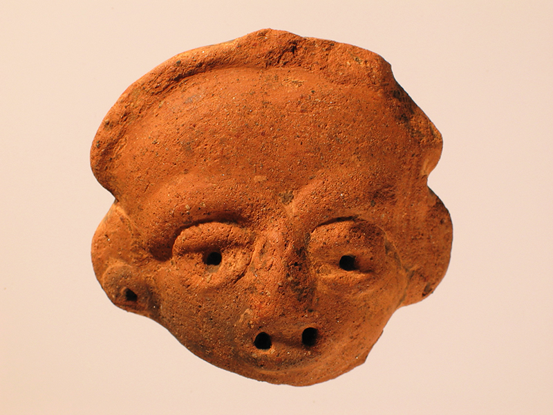Rappresentazione fittile di stile Usulután di una testa umana resa in modo schematico ed elementare. La superficie esterna mostra bruciature, abrasioni e poche tracce della pittura color crema che ricopriva l’oggetto. Gli occhi hanno il contorno in rilievo e l’iride perforato. Le labbra, semiaperte, presentano anch’esse due fori. Alcuni elementi ornamentali, come gli orecchini e il copricapo, avvicinano questo manufatto alla consueta tipologia delle figurine Usulután.