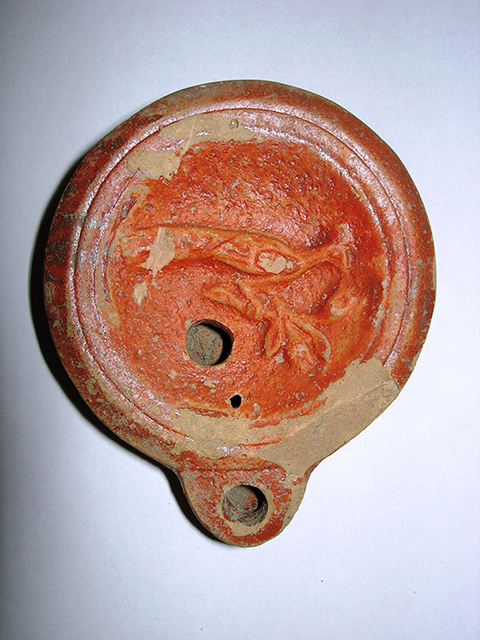 lucerna a disco con becco corto e rotondo, su disco pavone a destra su ramo