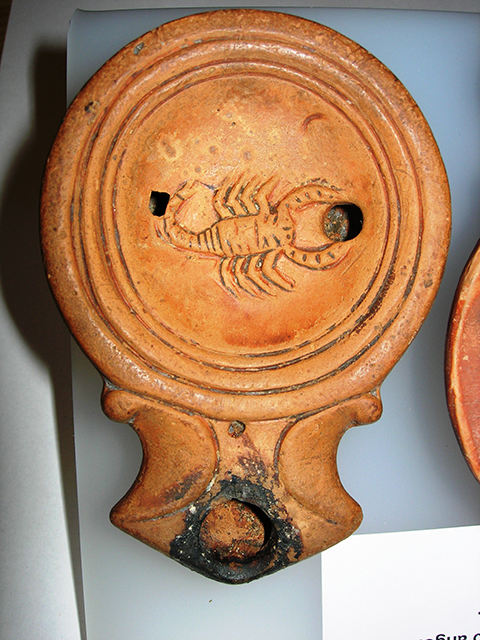 lucerna a volute con becco angolare, sul disco scorpione a destra