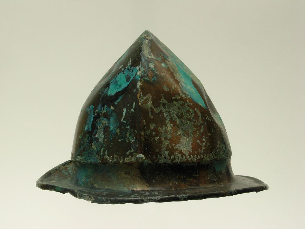 Elmo di tipo Negau di produzione etrusco-italica. Caratterizzato da una calotta a base circolare che presenta in cima una costolatura in senso longitudinale. La base è costituita da una breve tesa dall'orlo arrotolato all'insù. La base della calotta è decorata da un motivo inciso che ricorda una serie di palmette o elementi vegetali. L'elmo fu rinvenuto nel 1929 nel corso della prima indagine della grotta stessa che da esso prese il nome.
