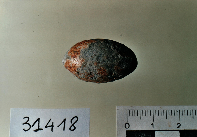 Ghianda anepigrafe, tipo Ic, forma ovoidale con ossidazione ferrosa e ampie abrasioni.