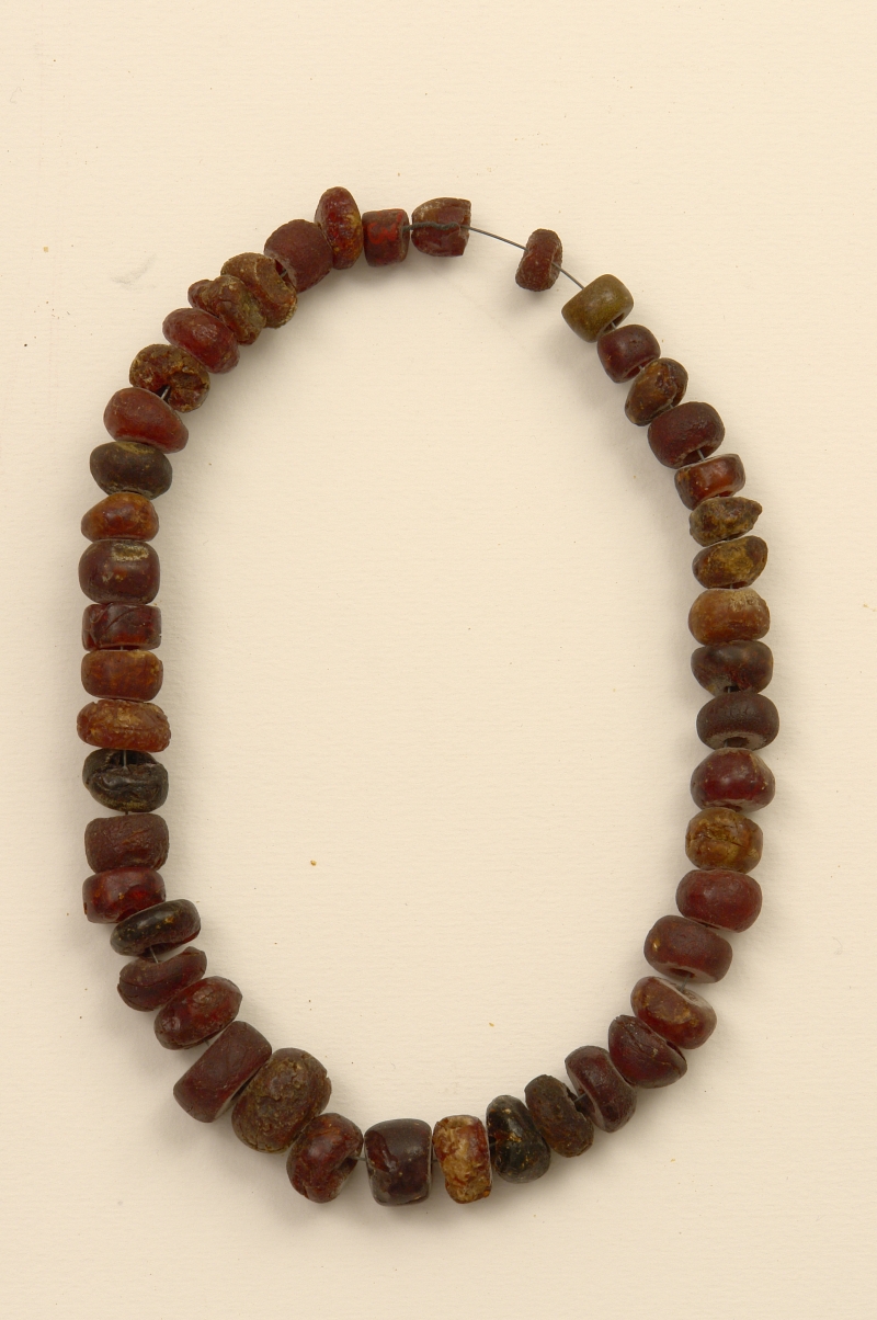 Collana costituita da 46 vaghi d'ambra di dimensioni e forme leggermente diverse (cilindrica, con estremità a profilo arrotondato; discoidale, ispessita). L'ambra ha colore da rosso bruno, semitrasparente, a bruno, semitrasparente. Al centro sono presenti due vaghi di dimensioni maggiori degli altri. Molti esemplari sono di fattura curata, hanno forma regolare e le superfici sono levigate. I fori passanti sono perfettamente circolari e con diametro simile.