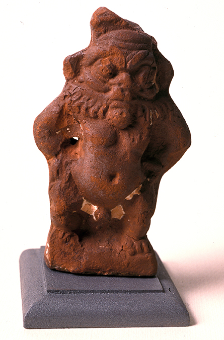 In periodo greco-romano il dio viene raffigurato in conformità al tipo fissato nel Nuovo Regno e mantiene le sue prerogative. La figurina del dio dal corpo di nano con grande testa è spezzata superiormente, per cui è andato perduto il copricapo a ciuffo di piume. Il volto dallo sguardo truce e dai lineamenti ferini è incorniciato dalla barba ispida e disposta a ventaglio. Ha orecchie sporgenti, mento pronunciato e gomiti in fuori con le mani sui fianchi, seno pendente, pancia rigonfia e corte gambe aperte tra cui è il sesso. Il dio poggia su una breve base quadrilatera inferiormente aperta. Modellato in stampo doppio, ha interno cavo. Il retro leggermente sagomato è lisciato, non presenta la tipica coda di Bes, ma al centro della schiena il foro circolare per la miglior riuscita in fase di cottura. Conserva tracce del rivestimento bianco.