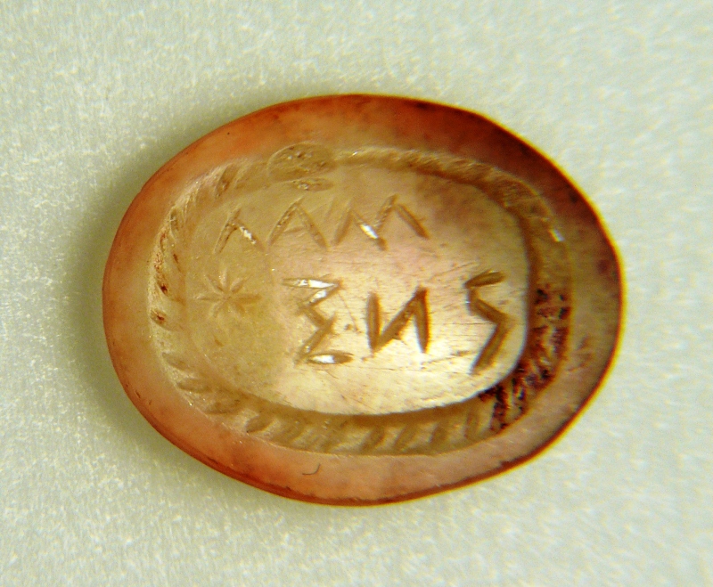 Gemma di forma ovale, inferiormente convessa. Serpente che si morde la coda formando un circolo magico, cosiddetto Ourobouros. All'interno, iscrizione greca su due righe LAM ENS; N retrograda. A sinistra della seconda riga, una stella a otto punte.