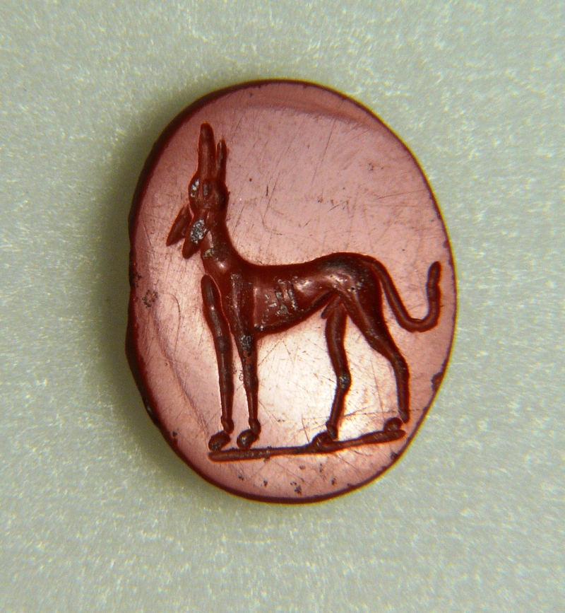 Gemma di forma ovale, piana, inferiormente troncoconica. Cane levriero stante a sinistra con la testa alzata nell'atto di ululare; linea di base.