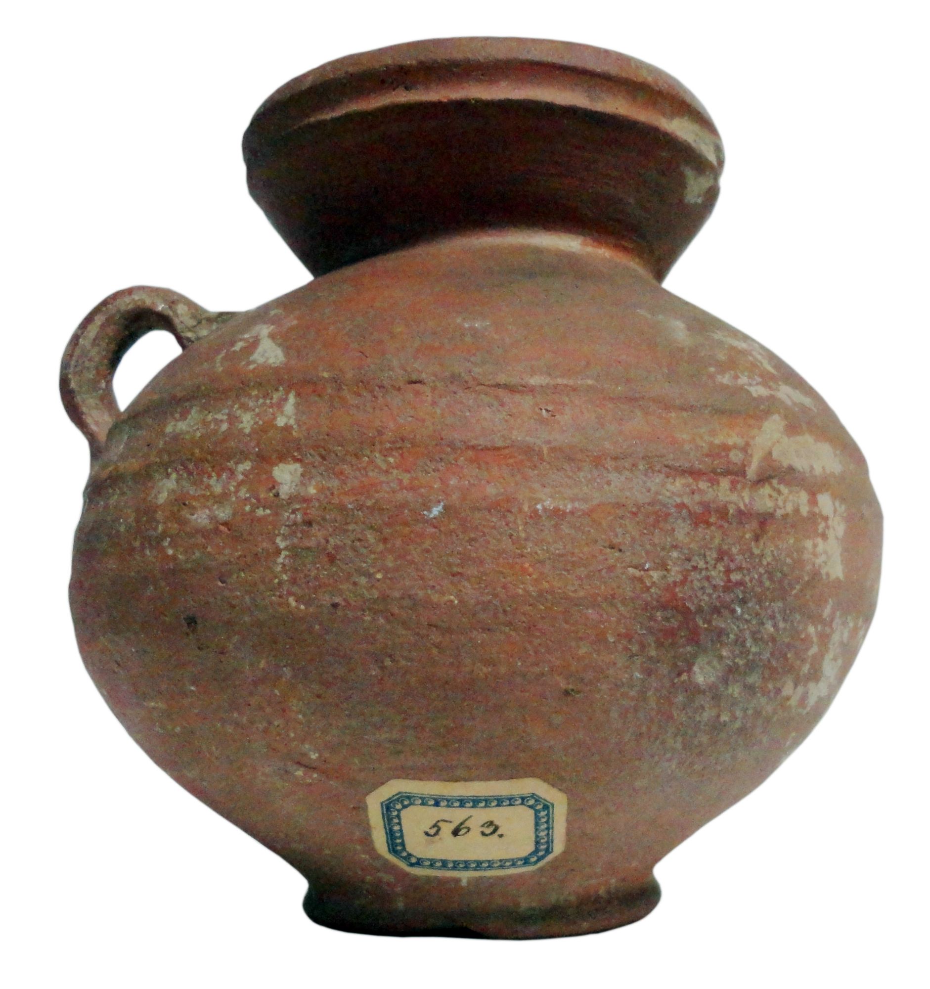Stamnos con tracce di scialbatura a ventre sferico e collo imbutiforme, ansa anulare impostata sul ventre e nel punto opposto una prominenza, forse le tracce di un'ansa perduta.