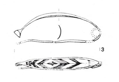 Frammento di fibula ad arco laminare decorato con motivi incisi a spina di pesce; breve staffa simmetrica.