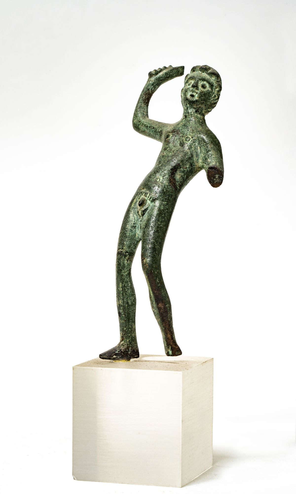 Statuetta di Ercole, forma slanciata e semplificata: rappresentato in piedi, nudo e imberbe, i capelli a corti riccioli. Il braccio destro alzato brandisce una clava. Mancano il braccio e il piede sinistro. Patina verde.