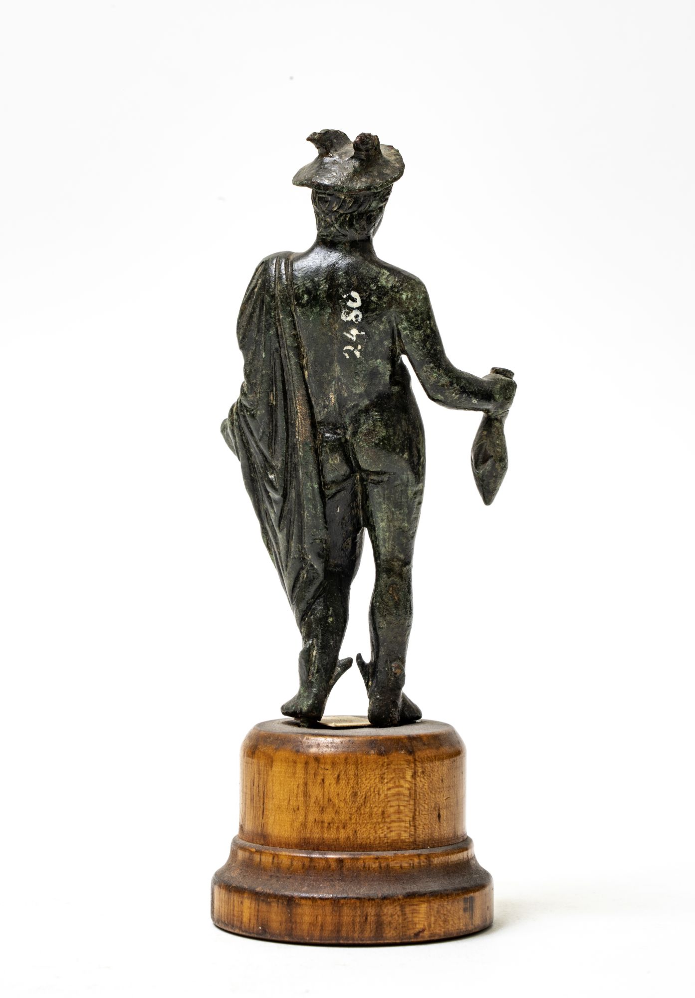 Statuetta di Mercurio seminudo: la sua "paenula" è allacciata sulla spalla sinistra ricadendo sul braccio e di lato in drappeggi. I piedi sono alati, la mano destra regge una borsa, sul capo il petaso munito di ali.