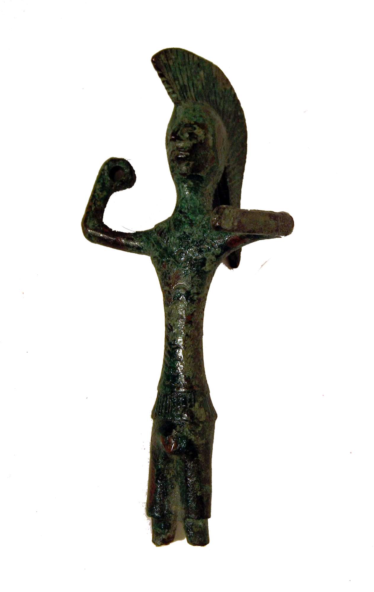 Statuetta di guerriero, ritta, veste una corazza a scaglie sopra la tunica pieghettata. Calzoni aderenti coprono la parte inferiore sino al ginocchio. Un elmo dall'ampia cresta cinge il capo aderente. Le braccia sono allargate lateralmente, la destra reggeva un'asta. Il sinistro è anch'esso piegato accenna ad imbracciare uno scudo. La patina inverosimile, il rendimento del volto e degli arti, gli elementi dell'armatura, concorrono a dimostrare che si tratta di un falso moderno.