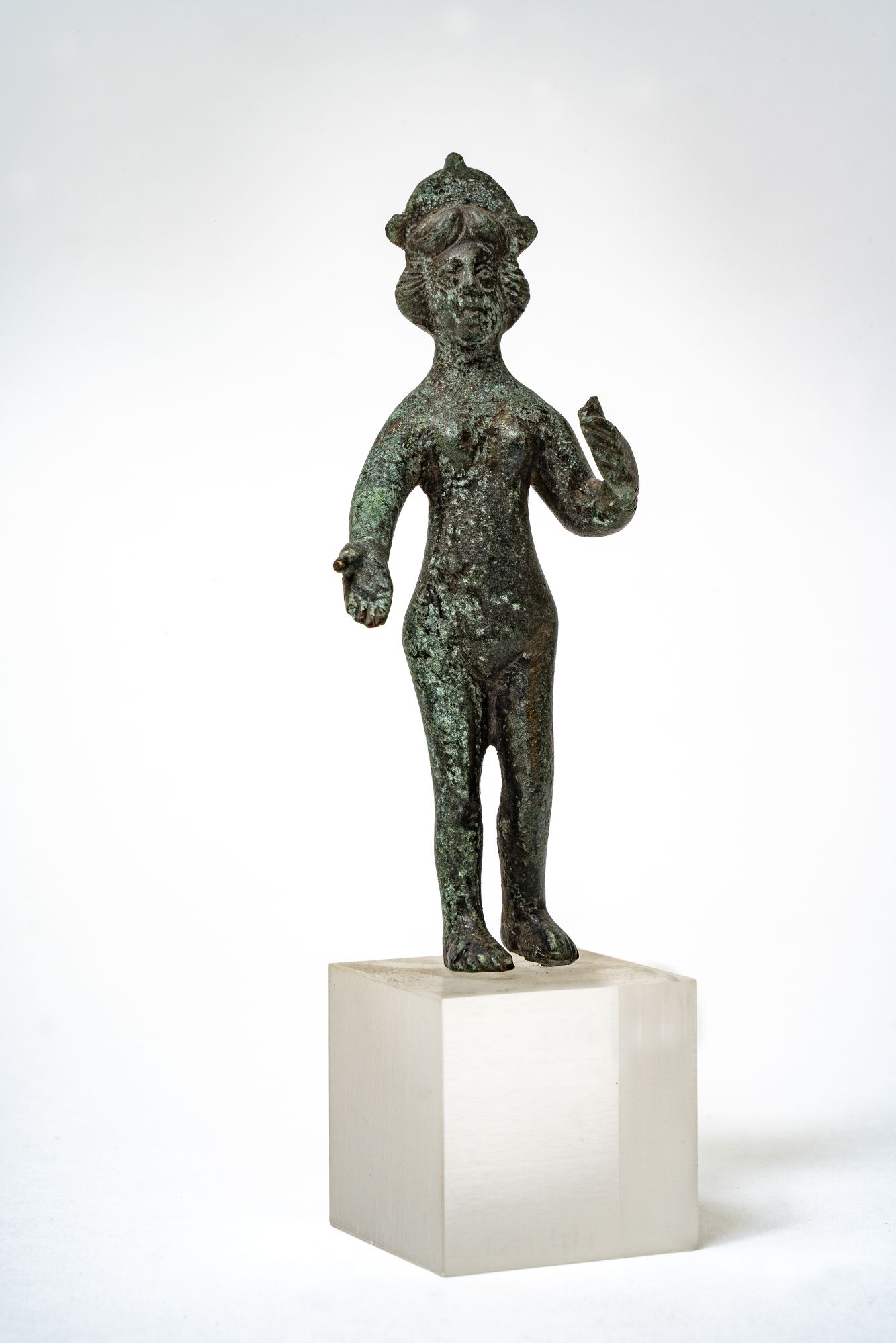 Figurina femminile nuda. Le gambe sono appena divaricate, ha la mano destra protesa a palma in su. La sinistra, col braccio scostato dal busto e piegato, reggeva un oggetto di cui resta la parte impugnata. Il tronco è adornato da due file di puntini impressi, che si incrociano e divergono sul ventre. Il viso si imposta su un collo largo, incorniciato da capelli in due bande sulla fronte, rigonfie ai lati delle guance e riunite in una piccola crocchia sulla nuca, sormontata da diadema a tre lobi.