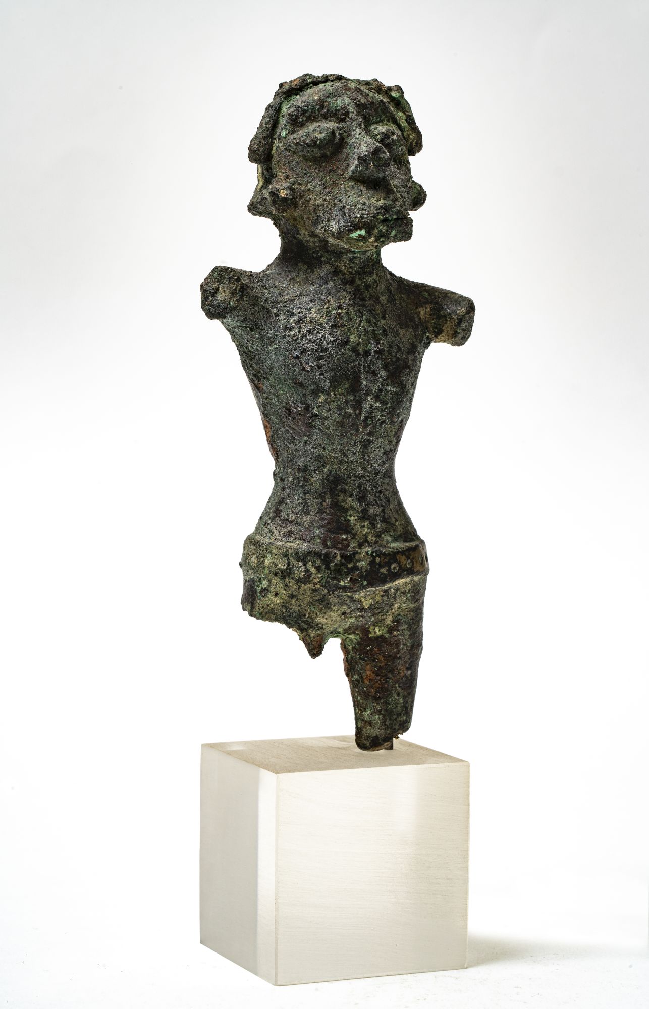 Figura stante, di gusto barbarico, presenta qualche analogia con figure di Celti. Occhi sporgenti, naso lungo e grosso, baffi spioventi, capelli disposti intorno al volto a mo' di diadema. Petto rigonfio, cintura bassa a borchie.