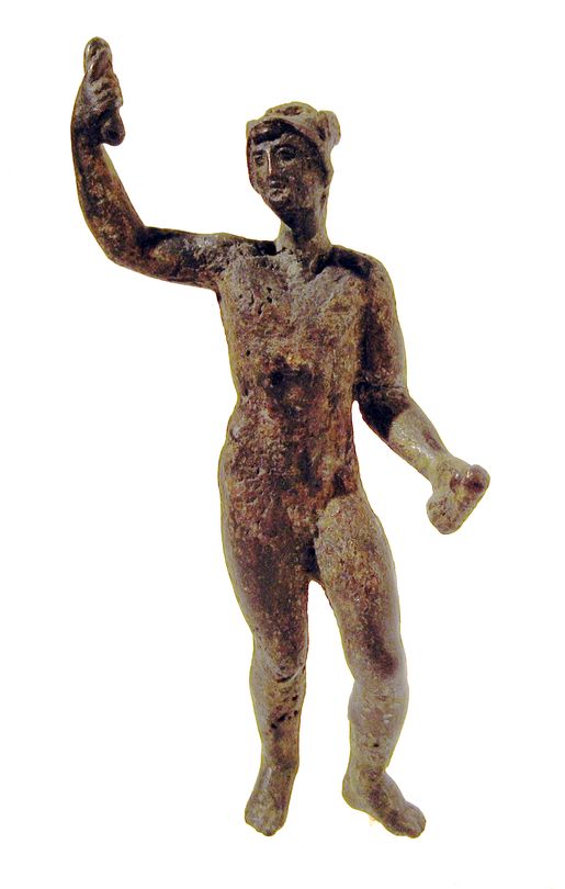 Statuetta di Mercurio con borsa nella mano sinistra e caduceo nella destra, alzata. Il capo, rivolto in alto a destra, porta il cappello alato. Piegate le ginocchia e lievemente mosse le gambe. L'espressione facciale è triste. Abbondanti forellini di fusione. Dato per falso.