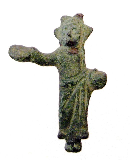 Figurina maschile arcaica, ammantata inferiormente, con diadema a 4 punte dietro alla testa, portante una patera nella mano destra protesa. Piatta posteriormente.