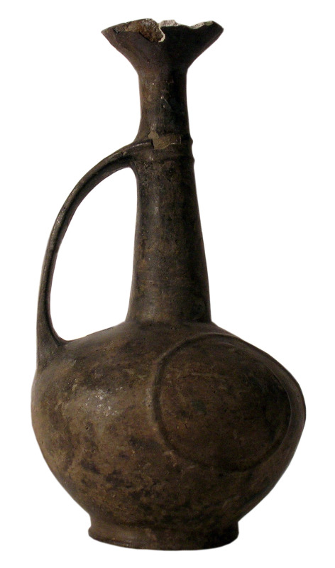 Brocchetta a corpo ovoide, leggermente appiattito, con piede ad anello rilevato, lungo collo conico, rastremato verso l'alto, e bocca ad imbuto, ansa verticale a nastro impostata tra il collo e la spalla. Colore grigio, con decorazione sul corpo con due costolature speculari che descrivono ampie spirali