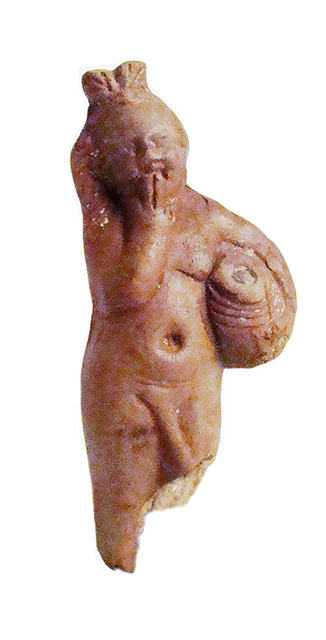 Il giovane dio si presenta stante, con il peso del corpo leggermente spostato sulla gamba sinistra in modo che l’anca destra sporga appena. Il braccio destro piegato porta due dita tese alla bocca, lieve variante alla tipica posizione di Arpocrate. Egli regge sotto il braccio sinistro un grande vaso rotondo a striature circolari o un cesto. Il capo rasato è coperto da una banda sormontata da due boccioli di loto. Sulla destra del volto la treccia di capelli. Il rilievo evidenzia le rotondità infantili all’inguine e al ginocchio e mette in risalto il lungo fallo del dio. La statuina è spezzata all’altezza delle ginocchia. Il retro lisciato ha grande foro rotondo per la miglior riuscita della cottura. L’interno è cavo.
