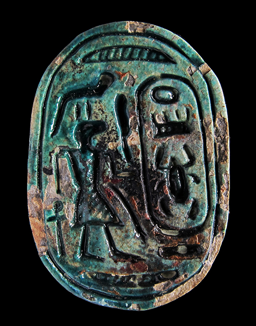 Scaraboide di aspetto alquanto insolito, sul cui ventre si vede una figura umana a testa di sciacallo in piedi davanti al cartiglio in disposizione verticale del prenome del faraone Thutmosi III, Men-kheper-ra. La figura tiene in mano una piuma; della decorazione fanno parte due segni neb, un serpente ed un segno ankh. Il dorso antropomorfo ritrae un uomo accucciato, con la testa girata di lato: si potrebbe interpretare come un prigioniero sottomesso. Foro passante longitudinale.