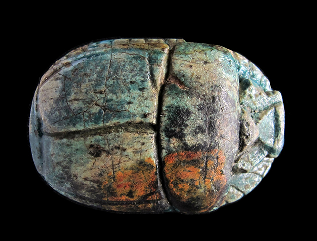 Scarabeo in steatite invetriata turchese con sul ventre, incisione, nel senso della lunghezza dello scarabeo, dell’immagine di una sfinge distesa, che probabilmente indossa una corona, davanti alle cui gambe vi è un cartiglio con i segni dello scarabeo e del sole. Così come è scritto, questo nome non appartiene ad alcun faraone: si tratta probabilmente di un cartiglio pseudo regale. Sopra la schiena della sfinge vi sono due segni nefer. Dorso con clipeo; protorace ed elitre incise. Foro passante longitudinale.