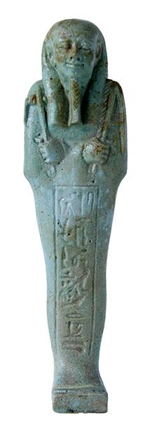 Statuina funeraria mummiforme che indossa una parrucca tripartita e la barba divina intrecciata. Le mani incrociate, la destra sopra la sinistra, portano rispettivamente una zappa e un piccone. Dalla spalla sinistra pende una sacca. Il pilastro dorsale si conclude in basso nella piccola base. L’iscrizione corre lungo una colonna frontale.