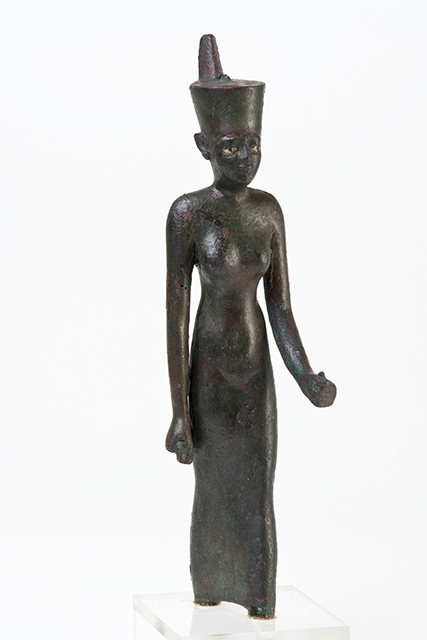 La dea di Sais è raffigurata in piedi, nell’atto di camminare, con la corona del Basso Egitto sul capo. Il braccio destro è sempre steso lungo il corpo, la mano chiusa a pugno, in alcuni casi a reggere un segno ankh. Il braccio sinistro invece è leggermente proteso in avanti, anche in questo caso con la mano stretta a pugno: nell’iconografia tradizionale della dea, essa regge un arco o uno scettro; non sembra però che queste insegne fossero previste per le statuine del museo, dal momento che non sono presenti fori per la loro inserzione. La dea indossa una lunga veste aderente, che si intuisce soltanto dallo spazio pieno tra le gambe e dalla linea che forma sulle caviglie.