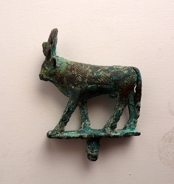 Bronzetto raffigurante un giovane torello incedente, con il disco solare tra le corna. La coda scende aderente alla zampa posteriore destra, le zampe poggiano su una piccola base, sotto la quale vi è un perno. Sulla groppa dell’animale si vedono, incisi sulla superficie, un disco solare alato e la gualdrappa.