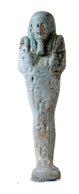 Statuina funeraria mummiforme, che indossa una parrucca tripartita con fermagli e la barba divina intrecciata. Le mani sono incrociate, la destra sopra la sinistra, e portano rispettivamente una zappa e un piccone. Dalla spalla sinistra pende una sacca. Il pilastro dorsale e la base sono presenti. L’iscrizione si trova sulle gambe dell’ushabti ed è a forma di T.