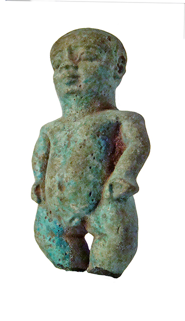 Amuleto in faience, raffigurante il dio minore Pateco, associato al dio Ptah e protettore degli artigiani. Il dio ha il corpo di un nano: nudo, ha la testa grande, normalmente rasata o con la calotta tipica di Ptah, il corpo tozzo e le gambe arcuate, con le braccia appoggiate sulle cosce. L'amuleto è spezzato all'altezza delle caviglie. Dietro il collo vi è un anello di sospensione.