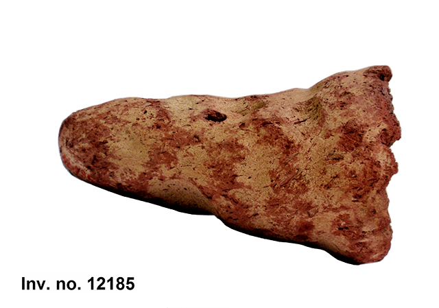 Il cono, con asse non perpendicolare alla base e vertice arrotondato, mostra evidente la forma anatomica della mano dell’artigiano e conserva tracce di ingobbiatura color crema. La base presenta due uomini inginocchiati affrontati in atto di adorazione, sotto una barca divina con due colonne di testo frapposte, completamente illeggibili. Le figure sono in rilievo (alto in media 2 mm) in un campo quadrato ribassato che l’artigiano ha impresso con forza, in modo che le quattro sezioni di cerchio, delimitate dalla circonferenza e dai quattro lati del campo, risultano in rilievo, irregolari e poco curate.