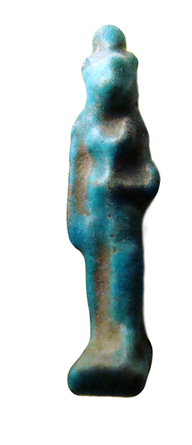 Amuleto in faience che raffigura la dea Sekhmet. L’iconografia è quella consueta, di donna con testa di leonessa. La dea è raffigurata stante, con il braccio sinistro piegato sul petto a reggere il lungo scettro wadj. Sul capo pare avere un disco solare. I piedi poggiano su una sottile base, che forma un tutt’uno con il pilastro dorsale, su cui sono incisi dei segni geroglifici, non comprensibili.