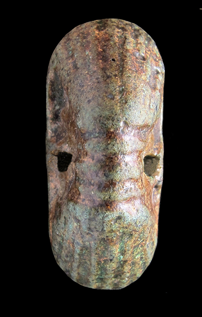 Sigillo in faience verde con incisione con il prenome del faraone Pepi I, Mery-ra. Dorso decorato con striature parallele, verticali alle estremità ed orizzontali al centro. Presa trasversale sul dorso.