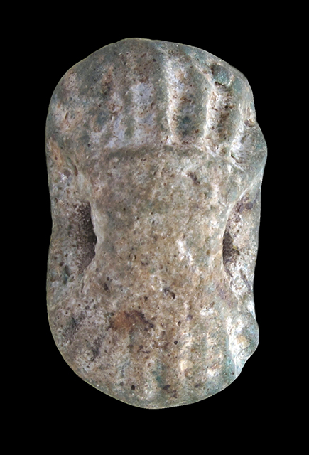 Sigillo in faience, con la raffigurazione di una figura femminile in atto di adorazione, davanti ad una tavola per offerte. Il dorso è decorato con striature parallele. La faïence in origine era di colore verde chiaro. Presa trasversale sul dorso.