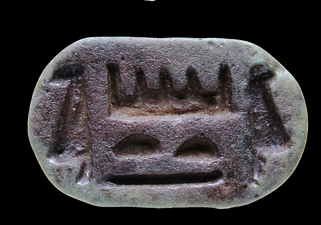 Sigillo in faience verde, con grafia corrotta del nome Amon-Ra, e il segno della canna fiorita raddoppiato. Dorso decorato da motivi vegetali stilizzati. Presa trasversale sul dorso.