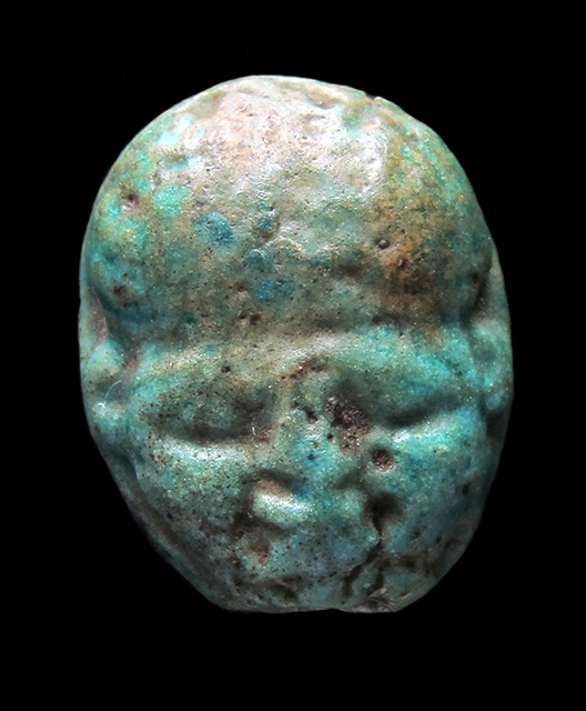 Scaraboide in steatite invetriata azzurra, con sul ventre ncisione della grafia difettiva del nome di Amon-Ra. Dorso a forma di testa umana dai lineamenti negroidi. La decorazione del ventre e del dorso sono capovolte l’una rispetto all’altra. Foro passante longitudinale.