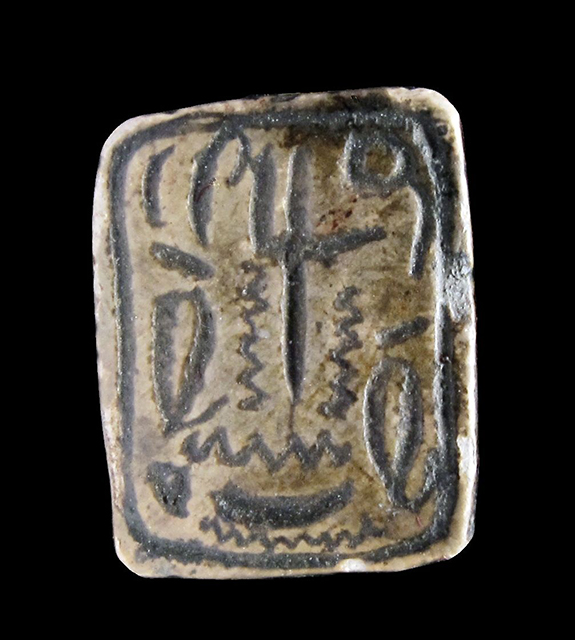 Piastra rettangolare in steatite marrone; su entrambe le facce sono presenti incisioni di segni geroglifici stilizzati, disposti senza un ordine apparente, il che non ne consente la lettura. Sono presenti delle serpentine come riempitivo. Foro passante longitudinale. Autenticità dubbia.