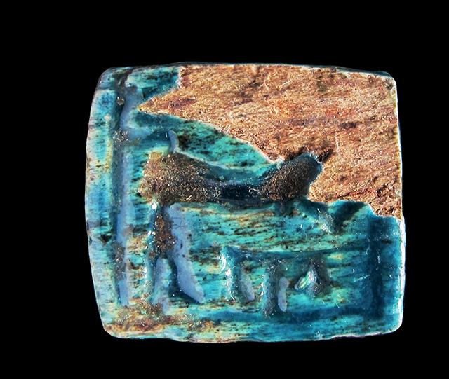 Piastra rettangolare in steatite invetriata turchese; Su una faccia sono presenti un cartiglio indecifrabile disposto verticalmente ed un falco con corona e flagello. Sull’altra, forse un animale (non ben visibile a causa della scheggiatura dell’angolo) ed alcuni segni. Foro passante longitudinale.