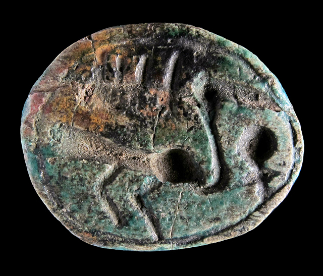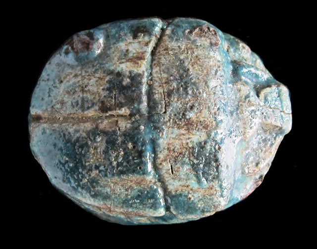 Scarabeo in steatite invetriata turchese con sul ventre una incisione crittografata del nome di Amon-Ra con anatra, segno men e geroglifico ankh. Questa, come le seguenti crittografie in cui compare un’anatra, mancano del consueto segno della piuma. Dorso con clipeo ed incisione a T che separa protorace ed elitre. Foro passante longitudinale.