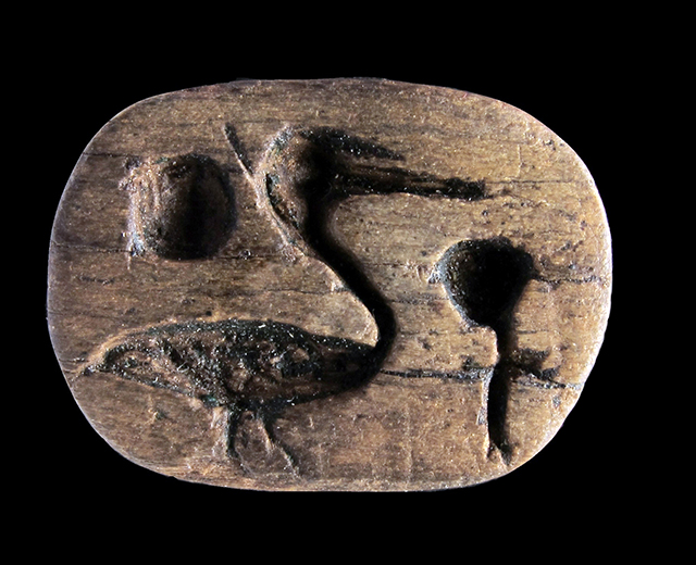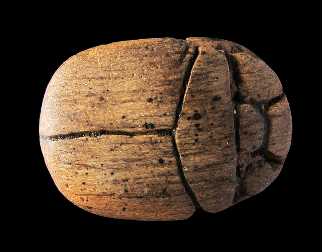 Scarabeo in steatite marrone con sul ventre crittografia del nome di Amon-Ra. Dorso con clipeo; protorace ed elitre separati da incisione a T. Foro passante longitudinale.