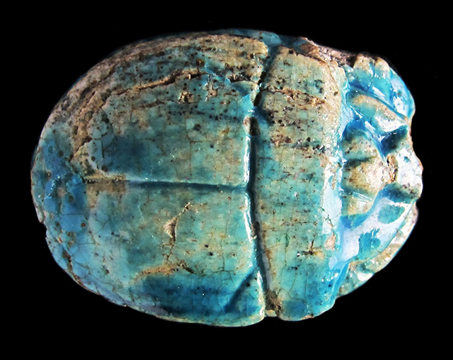 Scarabeo in steatite invetriata turchese con sul ventre incisione del nome di Amon-Ra tra due segni neb, disposto orizzontalmente. Dorso con clipeo, incisione a T che separa protorace ed elitre, le quali presentano piccole tacche a V. Foro passante longitudinale.