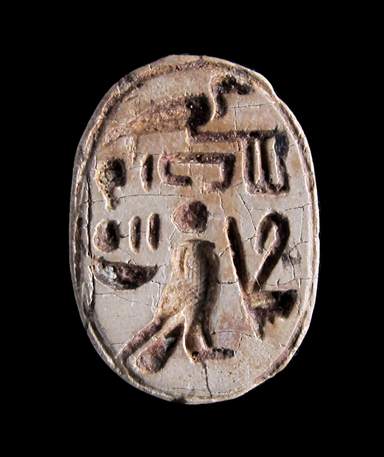 Scarabeo in steatite grigia; sul ventre incisione con segni geroglifici che costituiscono una formula non interpretabile con sicurezza. Dorso con clipeo e incisione a T che separa protorace ed elitre, le quali presentano tacche a V; sui lati si vedono le zampe ripiegate. Foro passante longitudinale.