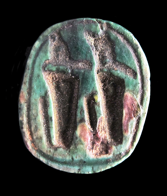 Scarabeo in steatite invetriata turchese con, sul ventre, l'incisione di due urei con le corone dell’Alto e Basso Egitto. Sebbene il dorso presenti una scheggiatura nella parte sinistra, sono comunque visibili il clipeo e la divisione tra protorace ed elitre. Foro passante longitudinale.